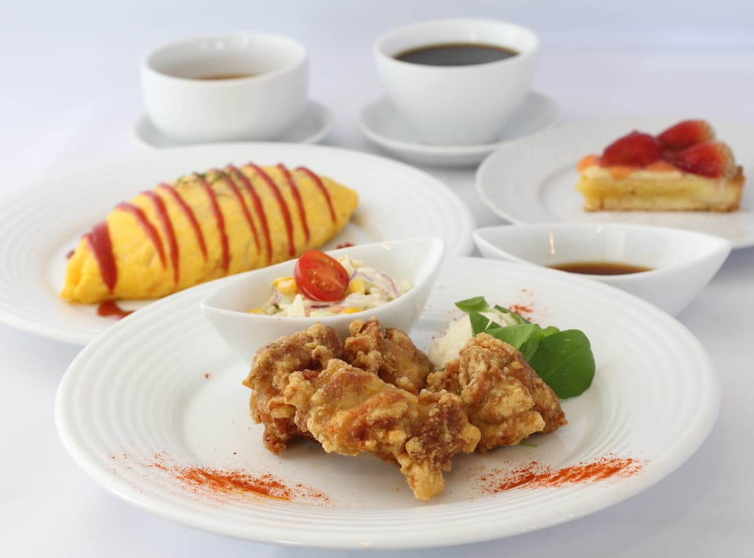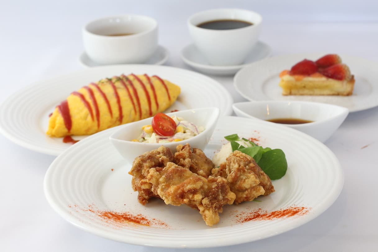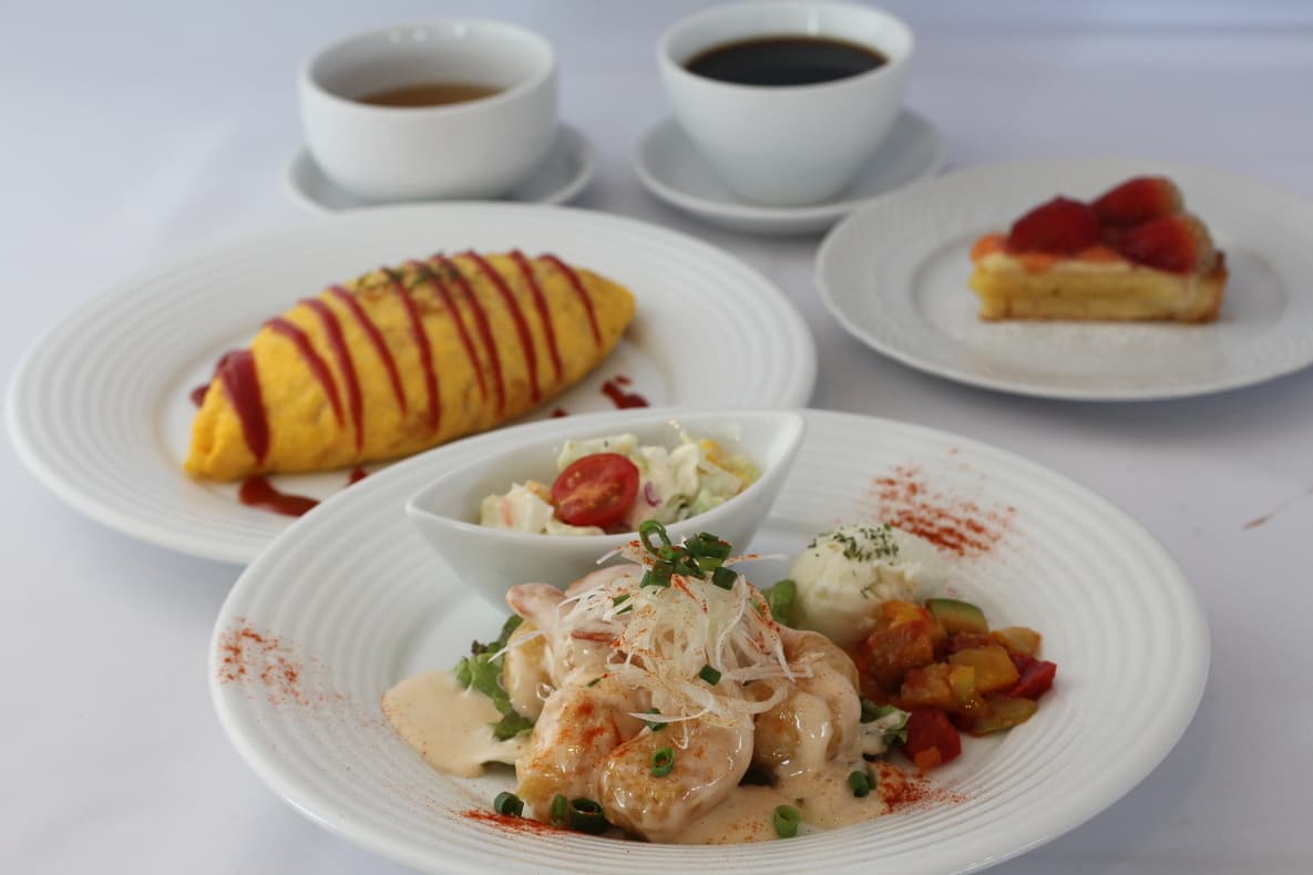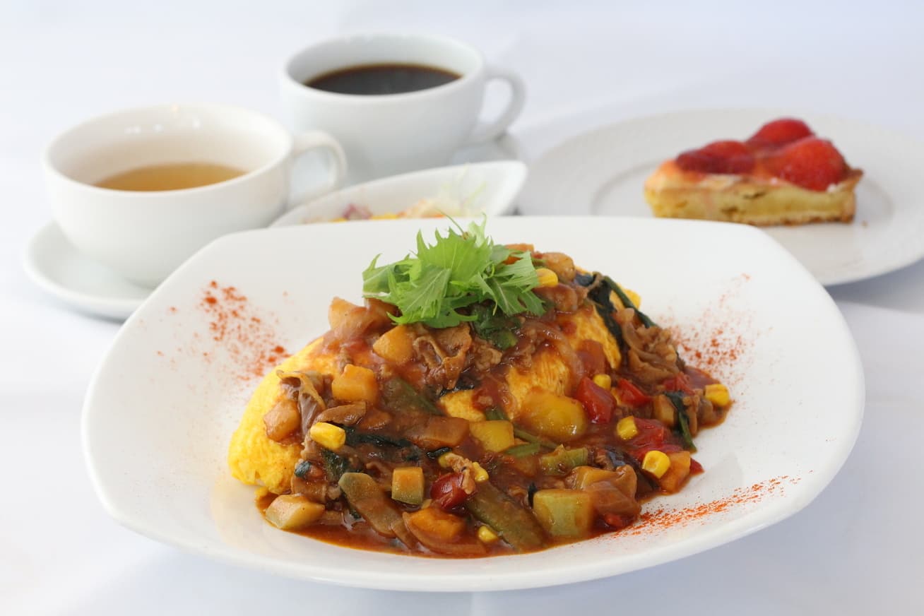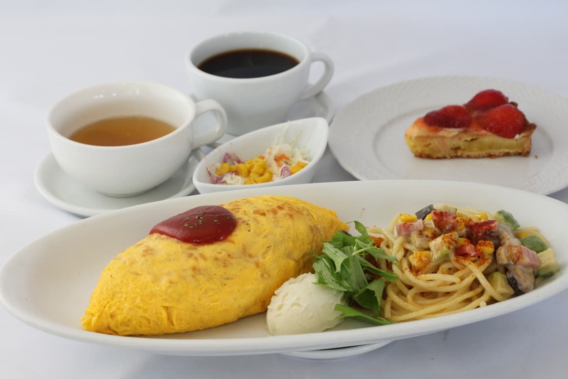 パスタと7種類から選べるソースのオムライス、ドリンク付